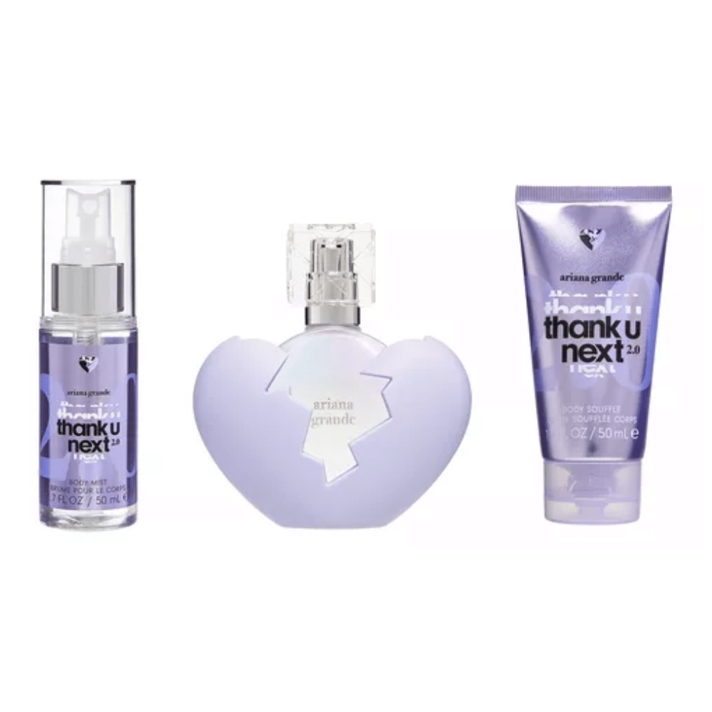 Estuche Ariana Grande Thank U Next 2.0 incluye eau de parfum, body mist y crema corporal, combinando notas frutales y florales para una experiencia aromática dulce y sofisticada.