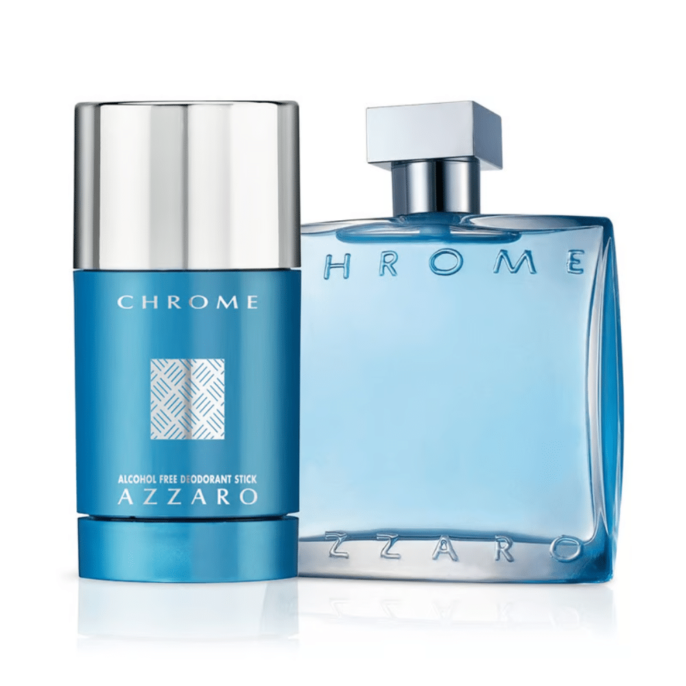 Este set combina la icónica Eau de Toilette Chrome en su presentación de 100 ml con un desodorante en barra de 75 ml, brindando una experiencia olfativa completa que acompaña al usuario a lo largo del día.