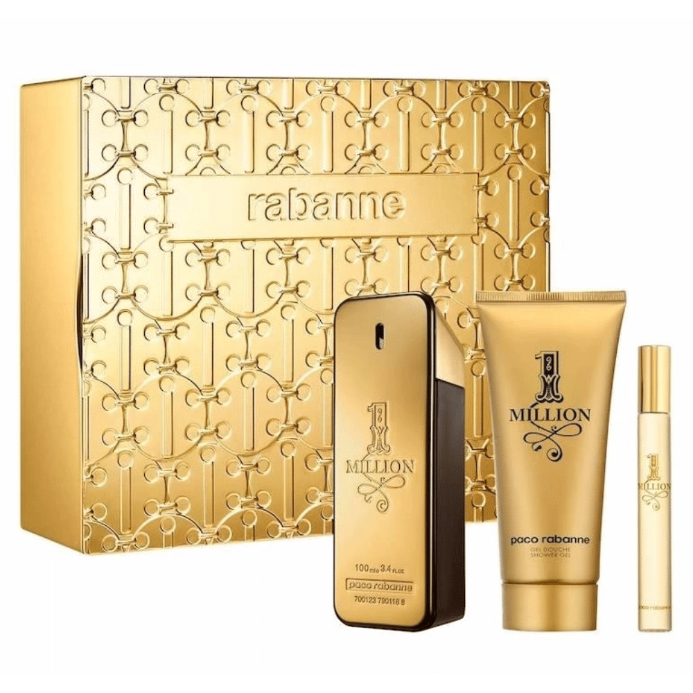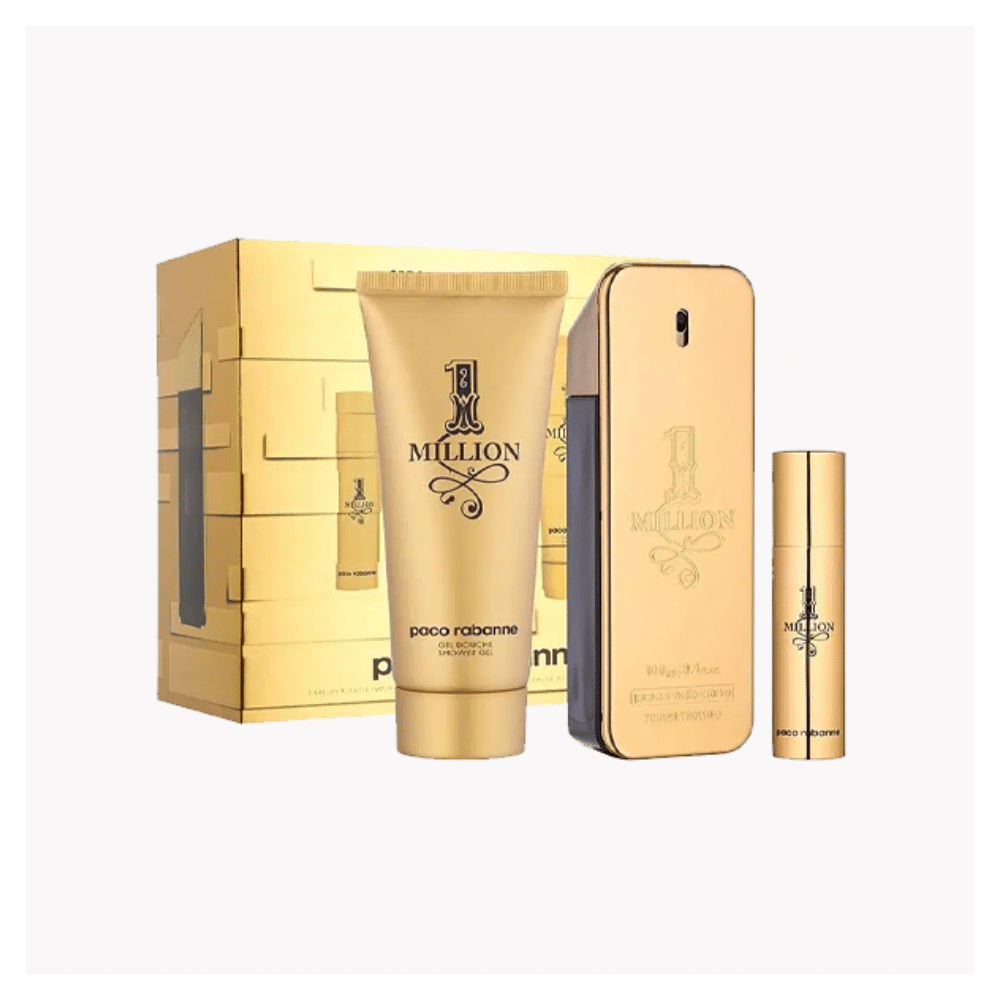 La caja suele incluir el frasco de 1 Million Eau de Toilette, con su emblemática forma de lingote de oro, símbolo de éxito y poder.