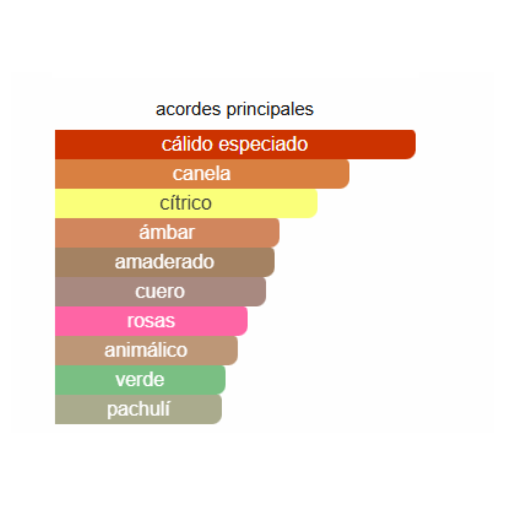 En su apertura, resalta la frescura de la menta y la mandarina sanguina, seguida de un corazón especiado con canela y rosa, que añade calidez y seducción.