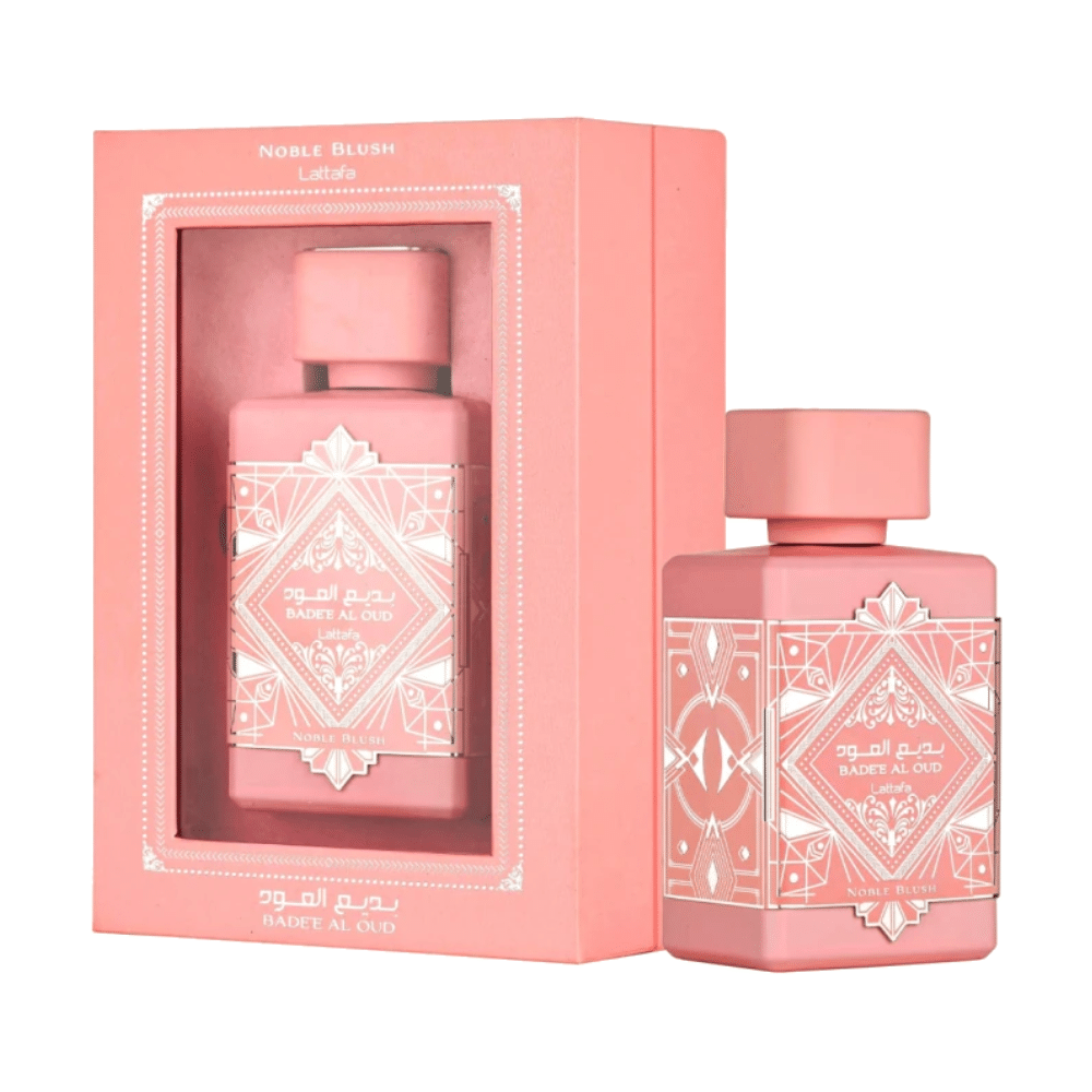El frasco de Lattafa Noble Blush refleja la esencia de la fragancia con un diseño elegante y femenino.