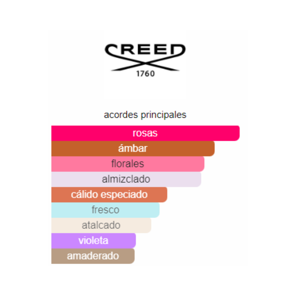 El aroma de Creed Carmina puede ser descrito como: – Fresco y frutal en la cabeza – Floral y sensual en el corazón – Cálido y sensual en la base – Elegante y femenino en general Creed Carmina es un perfume que ha sido diseñado para evocar la sensación de lujo y sofisticación, con un aroma que es fresco, femenino y atractivo.