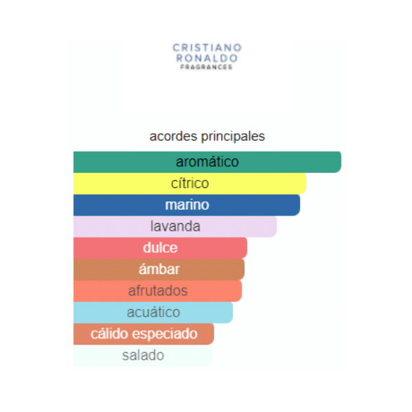 CR7 Play It Cool se lanzó en 2019. Las Notas de Salida son mandarina, pera y bergamota; las Notas de Corazón son notas marinas, lavanda y cardamomo; las Notas de Fondo son haba tonka, Amberwood y almizcle.