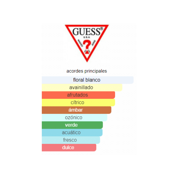 Guess Double Dare se lanzó en 2015. Las Notas de Salida son mandarina, lichi y fresa; las Notas de Corazón son hojas de violeta, jazmín y lirio de los valles (muguete); las Notas de Fondo son vainilla, ámbar y vetiver.