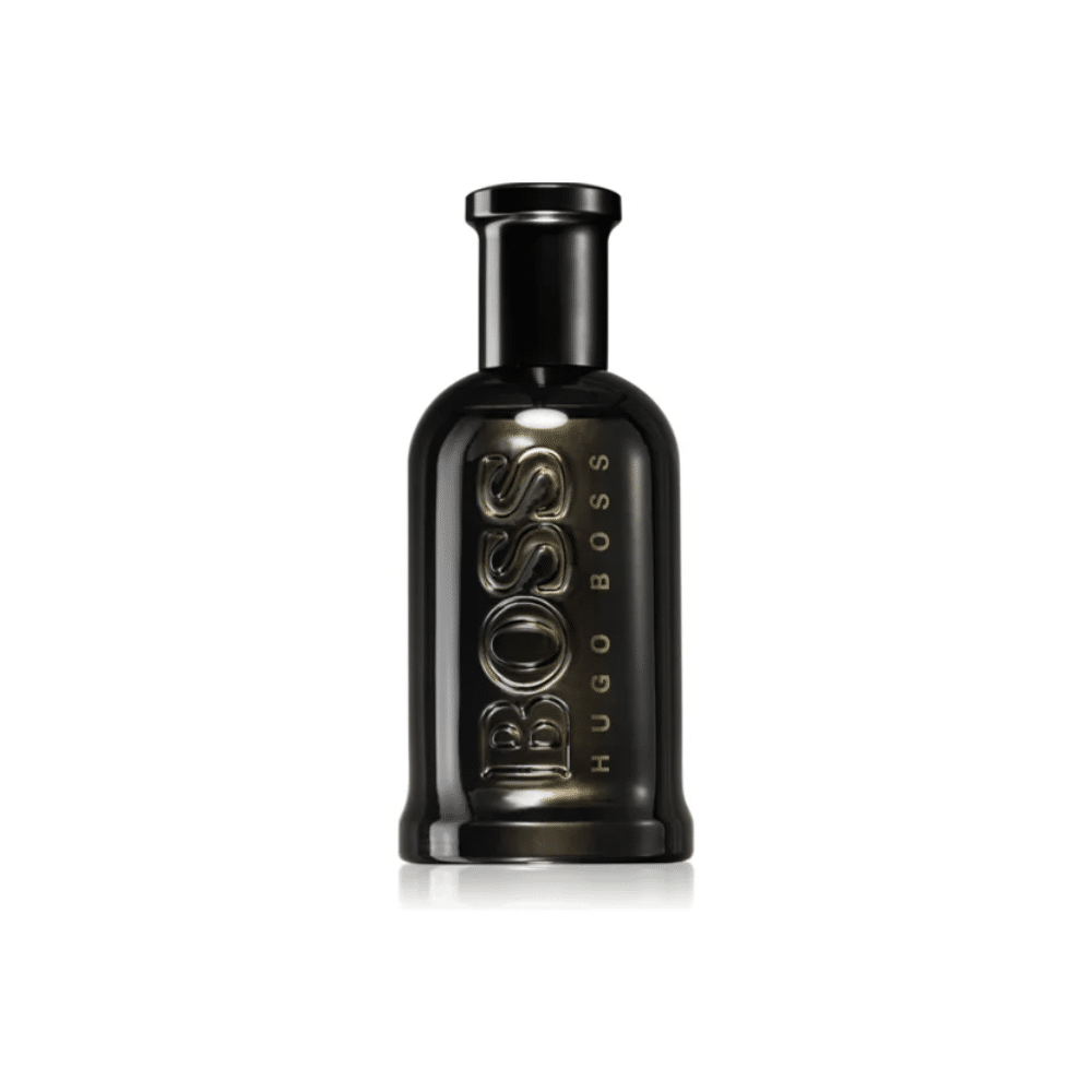 El frasco mantiene el icónico diseño de la línea Boss Bottled, pero con un acabado en tonos oscuros que reflejan la intensidad y sofisticación del perfume.