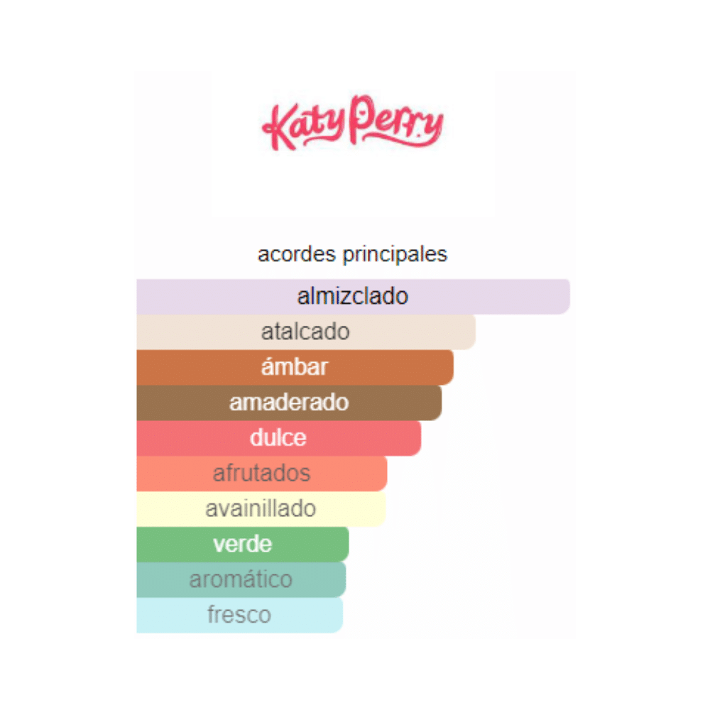 Katy Perry’s Indi se lanzó en 2017. Las Notas de Salida son ciruela, té Blanco y bergamota; las Notas de Corazón son extracto de cedro blanco, lirio de los valles (muguete) y ciclamen (violeta persa); las Notas de Fondo son almizcle, almizcle blanco, almizcle negro, almizcle egipcio, almizcle isleño, haba tonka y ámbar.