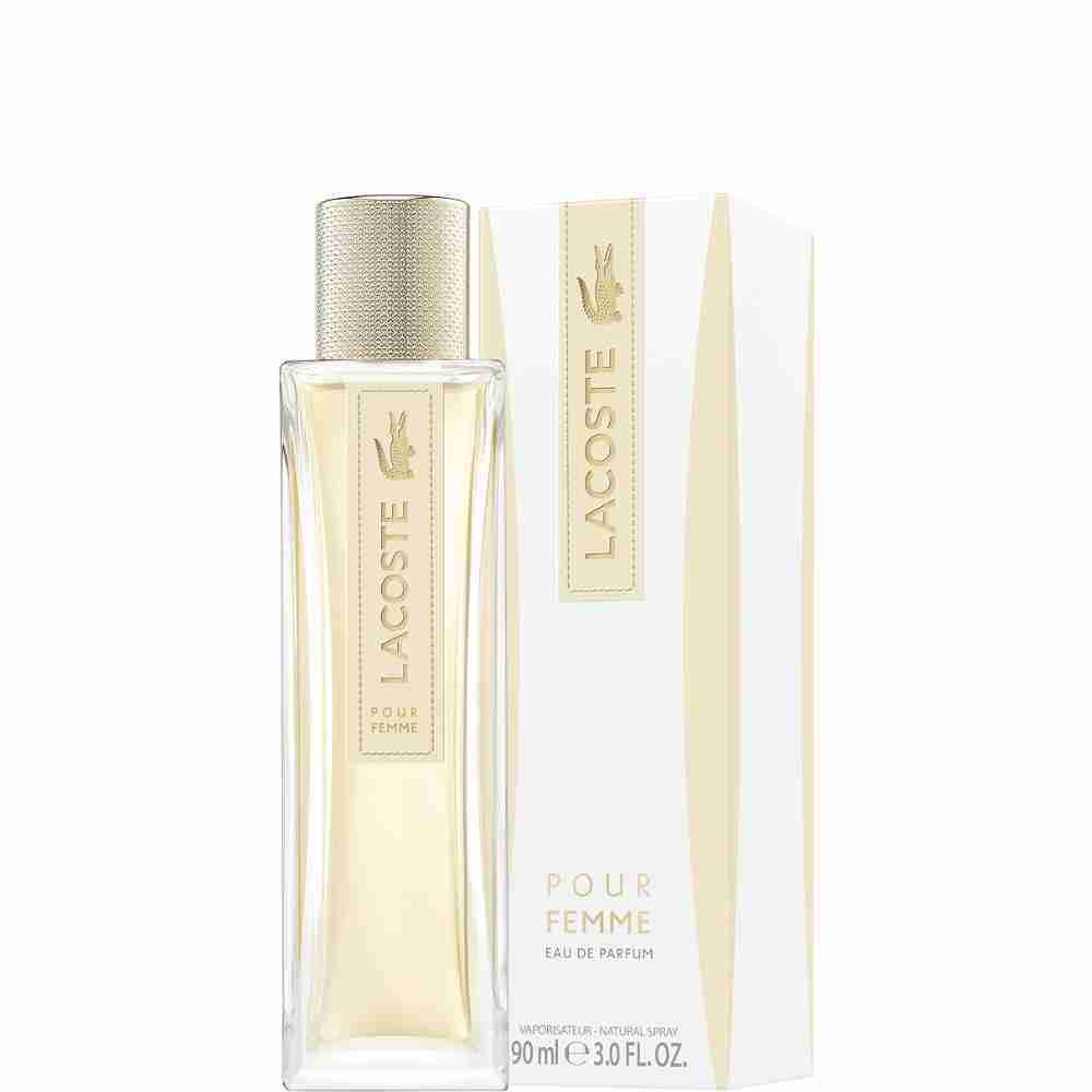 Lacoste Pour Femme se lanzó en 2003. Las Notas de Salida son pimienta, fresia y manzana; las Notas de Corazón son heliotropo, violeta, jazmín, hibisco (flor de Jamaica, cayena) y rosa; las Notas de Fondo son gamuza, sándalo, incienso, cedro y ládano.