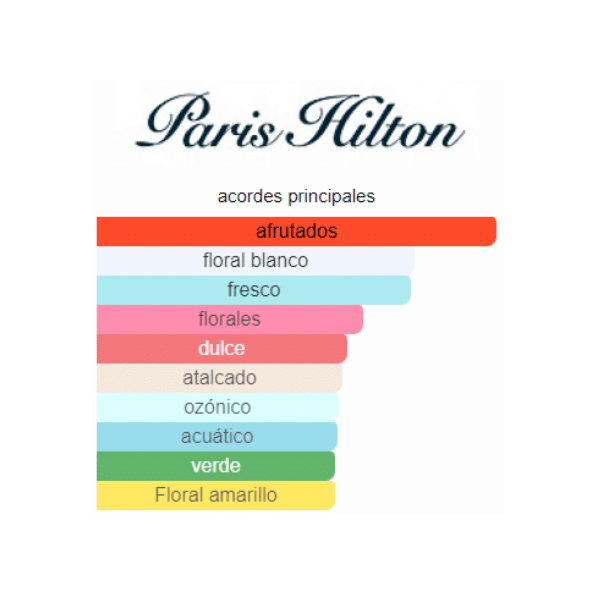 Paris Hilton se lanzó en 2005. Las Notas de Salida son melón, manzana y durazno (melocotón); las Notas de Corazón son fresia, mimosa, lirio de los valles (muguete), jazmín, azucena y nardos; las Notas de Fondo son almizcle, ylang-ylang, sándalo y musgo de roble.