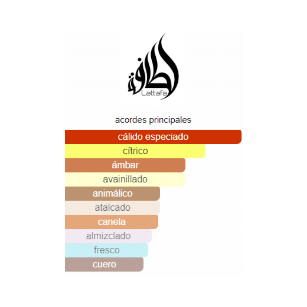 Este perfume árabe, creado por la prestigiosa casa Lattafa, combina notas vibrantes y sofisticadas que capturan la atención desde el primer instante.