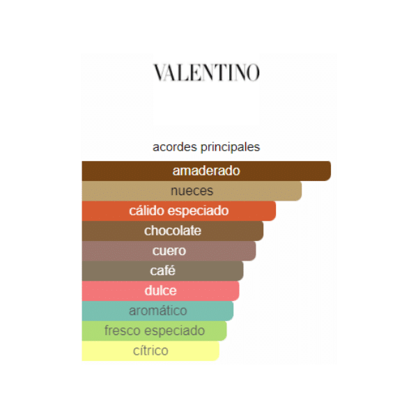 Valentino Uomo se lanzó en 2014. Las Notas de Salida son bergamota y mirto; las Notas de Corazón son avellana, chocolate y granos de café tostado; las Notas de Fondo son cuero y cedro.